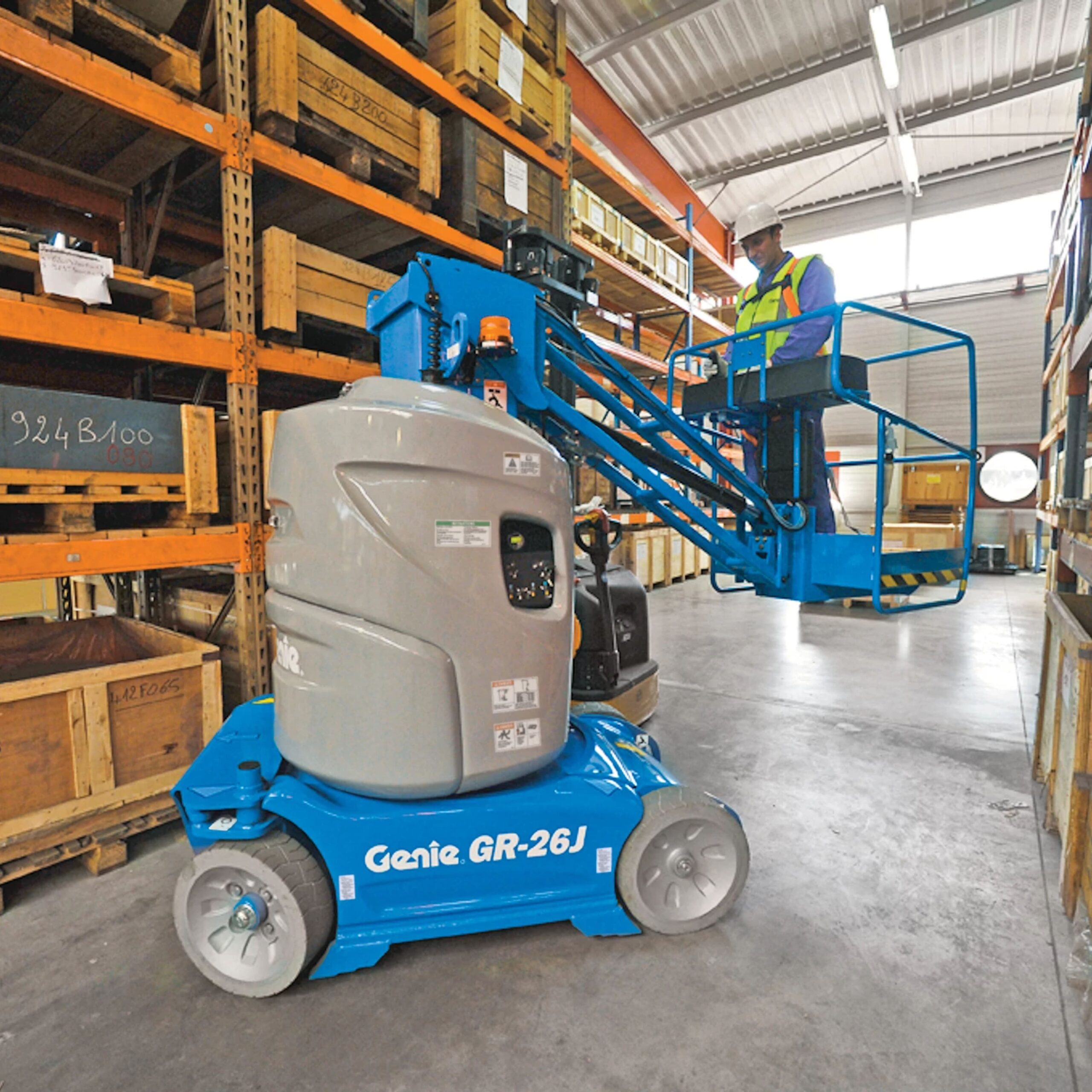 This vertical mast boom lift makes quick work of elevated maintenance, painting, lighting and repair work. This personnel lift has capable maneuverability and is easily operated and driven from the platform, which has a lift height of up to 26′. In addition, our vertical boom lifts are designed to fit in narrow spaces, such as through doorways and into freight elevators.