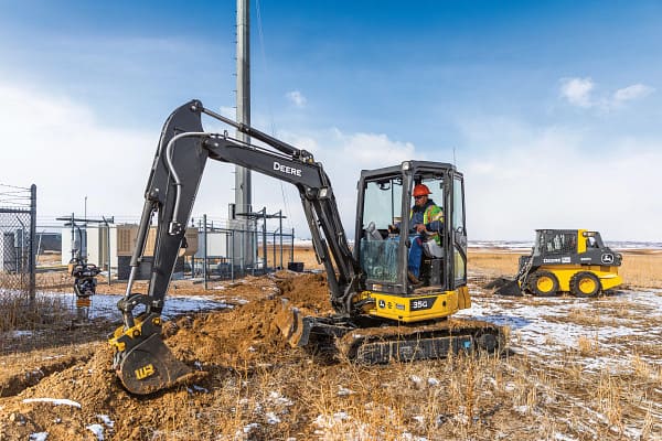 This mini excavator is ideal for earthmoving in compact working conditions. This 6,800 to 8,000 lb. mini excavator rental is diesel powered, features a maximum dig depth of up to 9’2″ depending on model and zero tail swing. Where available, models may have an enclosed cab with optional heat and air conditioning. Our mini excavators for rent come from top brands like John Deere and Case.